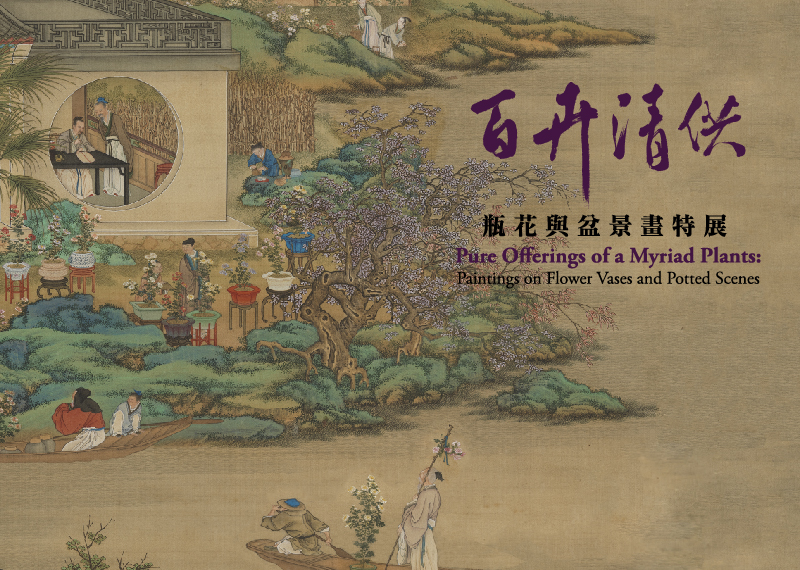 今年適逢臺灣舉辦世界花卉博覽會,本院特以「百卉清供-瓶花與盆景畫特展」為主題,將賞心悅目的花藝插作與盆景藝術結合,透過繪畫之美,與此次花事盛會相互呼應。長久以來,植物一直是藝術家創作靈感的來源,其枝幹、花葉的繁複構造與多樣的色彩面貌,展現出大自然奧妙與季節的變化。花木可在土地自然生長,亦可經由人工培育,再移入室內賞玩。而將植物轉化為審美對象與藝術題材,其形式除折枝寫生外,常見還有「瓶花」與「盆景」。「瓶花」顧名思義,即用容器插貯四季花卉,花枝剪裁講求比例姿態;「盆景」乃將木本、草本植物經過修剪、攀紮移種於盆盎,兩者皆著重表現人為的造化之美。瓶花始於六朝至唐代禮佛供花而來;歷經宋、元的發展,花卉品種增多,培植技術成熟,加上陶瓷工藝蓬勃發展,折枝插瓶逐漸形成風尚。明、清園藝繁榮興盛,文人雅士蒔花藝卉,對花木、湖石審美的講究,眾多品賞專著相繼問世,更促成了盆景的精緻化。